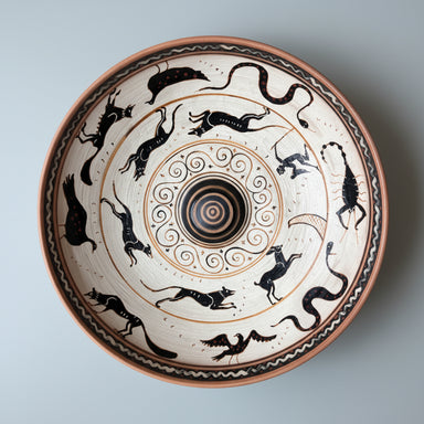 €435,00| /White Ground Phiale This exquisite ceramic phiale showcases an intricate hunting scene, meticulously rendered in the white-ground technique. Around...