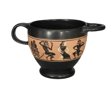 Black Figure mug with vertical handles depicting a group of dancing maenads and satyrs, ca. 520 BCE Dimensions H: 8.5cm, Rim D: 9cm, Max L: 15cm