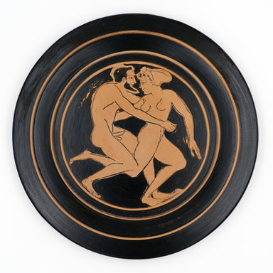 Red figure plate depicting a couple in an amorous embrace. One-of-a-kind, from Thetis cabinet This ceramic plate showcases a finely detailed red f...