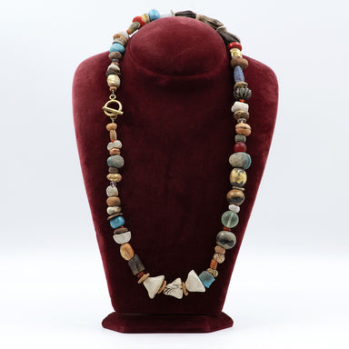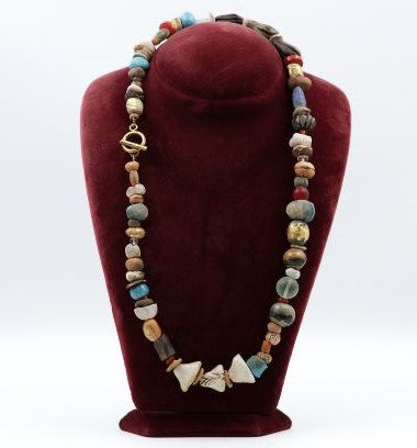 A unique necklace made from an assortment of faience, ceramic, porcelain, glass, lapis and carnelian beads with a gold plated silver clasp. THETIS...