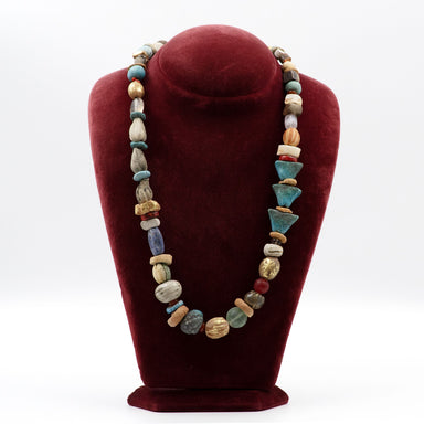 A unique necklace made from an assortment of faience, ceramic, porcelain, glass, lapis, coral and carnelian beads with a gold plated silver clasp. ...