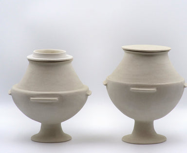 Collared storage jar with a tall, cylindrical foot. Hand-built using fine white clay and coated with a thin interior glaze. The piece was fired in ...